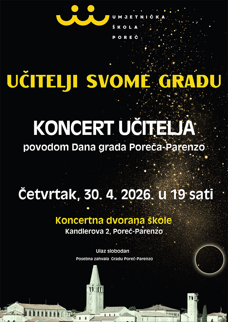 Umjetnička škola Poreč s velikom radošću i ponosom najavljuje tradicionalni “Koncert učitelja”, koji će se održati u četvrtak, 30. travnja 2026. godine, s početkom u 19 sati u Koncertnoj dvorani škole, Kandlerova 2.